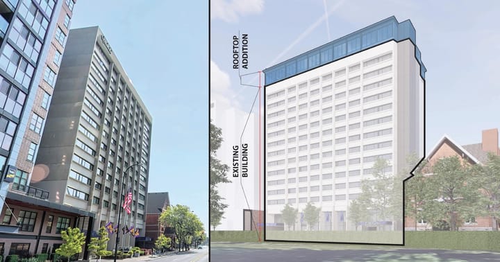 🍸️ Rooftop Bar: The Graduate Hotel (615 E. Huron) has submitted a formal proposal to the city to add a floor to the 14-story hotel to create a rooftop bar and private event space. The plan is currently in the city’s development review pipeline.